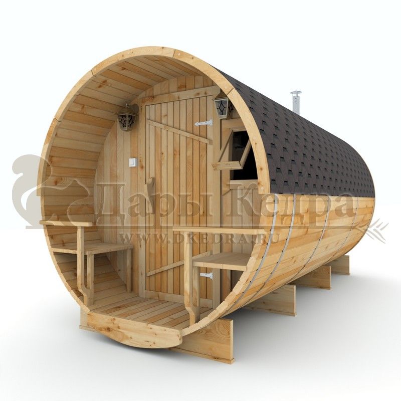Баня-бочка буханка из кедра с боковым входом (все размеры) Это самая просторная модель бани. Благодаря этому ее можно использовать не только по назначению, но и в качестве летнего домика. Боковой вход у такой модели находится в начале или в середине конструкции. Моечная оснащена душевым поддоном. Двухуровневый открытый полок и лавочка в парилке сделает принятие процедур более комфортным. По вашему желанию баню-бочку можно дополнить печью с внешней загрузкой, благодаря которой весь мусор после топки останется на улице. Баня-бочка буханка из кедра с боковым входом не требует полноценный фундамент, поэтому при необходимости ее можно перенести в другое место. Обращаем Ваше внимание, что в стандартную комплектацию бани входят полки открытого типа в парной с обеих сторон. Дополнительно можно заказать полок закрытого типа или лавку! Кедр обладает ароматическими свойствами. Он не деформируется и влагоустойчив, при правильном уходе за деревом на нем не развиваются грибки и плесень.
