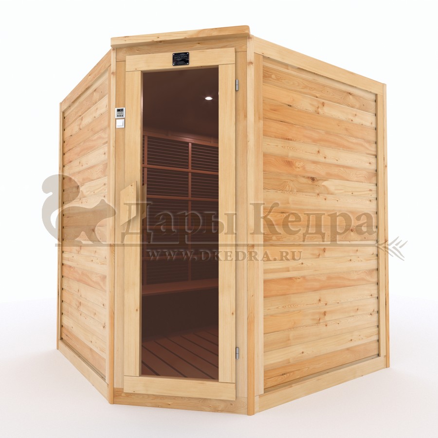Это специально оборудованная кедровая кабина для прогрева тела человека сухим теплом. Воздух в таких парных не нагревается. Инфракрасные лучи воздействуют на тело, равномерно прогревая мышцы, суставы и органы. Карбоновые излучатели, встроенные в стены кабины, обладают мягким прогревом, что полностью исключает возможность ожога. Работает кабина за счет электричества. Установка сауны в угол, позволяет рационально использовать пространство помещения. Подходит как для домашнего использования, так и для коммерции.