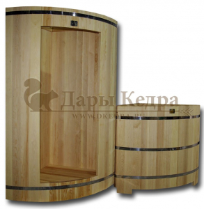 Угловая душевая кабина из кедра с закруглённым фасадом без двери, предполагает наличие шторки (гибкая штанга приобретается отдельно) лёгкая и изящная, впишется в любой интерьер и будет хорошо смотреться. Угловая душевая кабина подойдет как для домашнего использования, так и для коммерции.